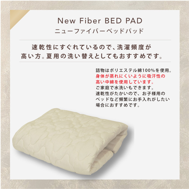ボリューム感と吸汗性を付加したポリエステル綿を使用したベッドパッドに、 耐久性の良い上質な綿100%のボックスシーツ×2枚を合わせた3点パック。